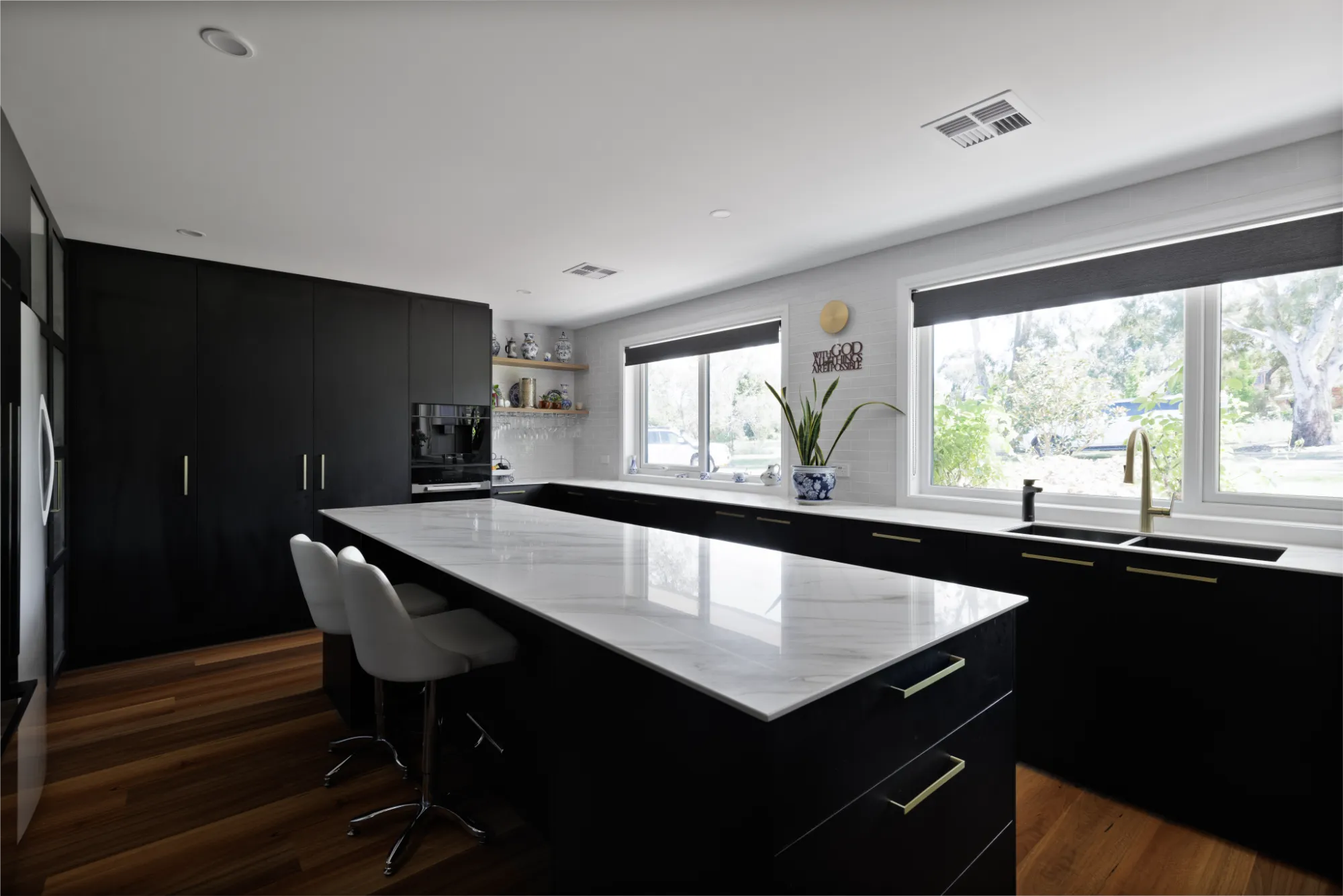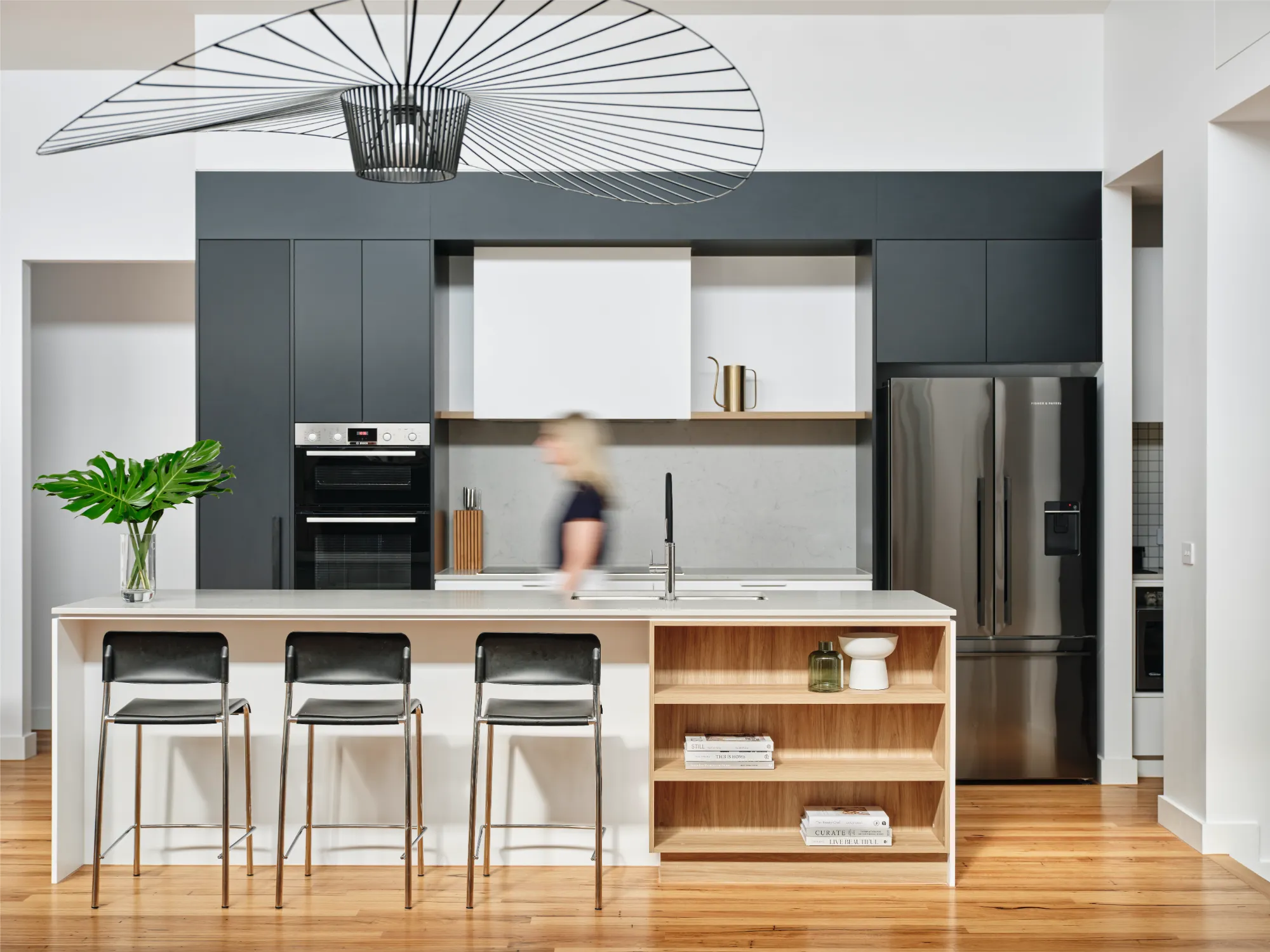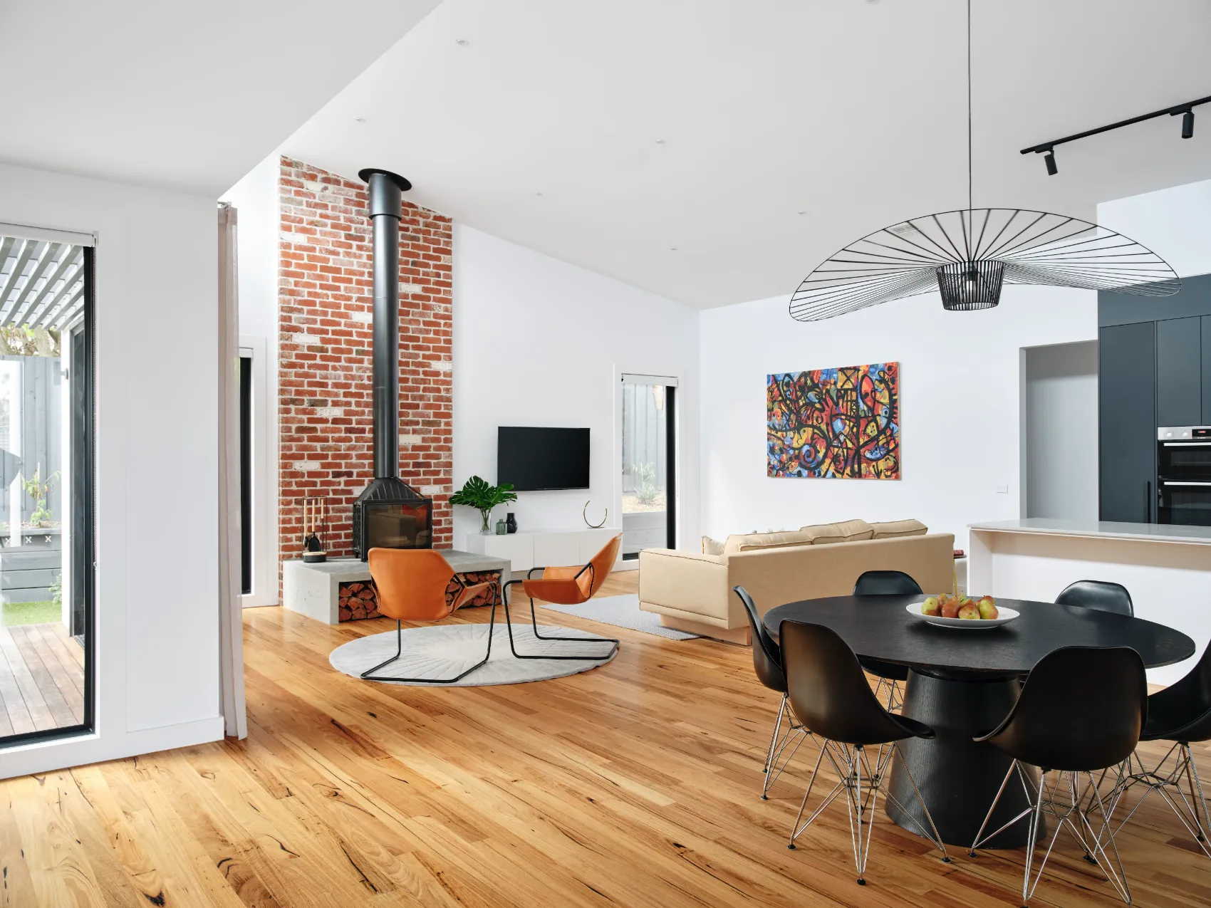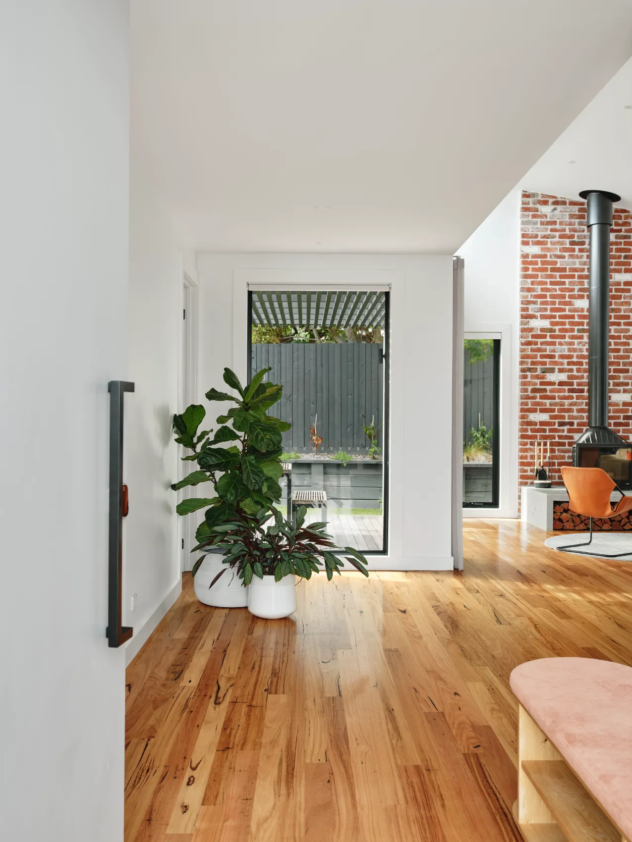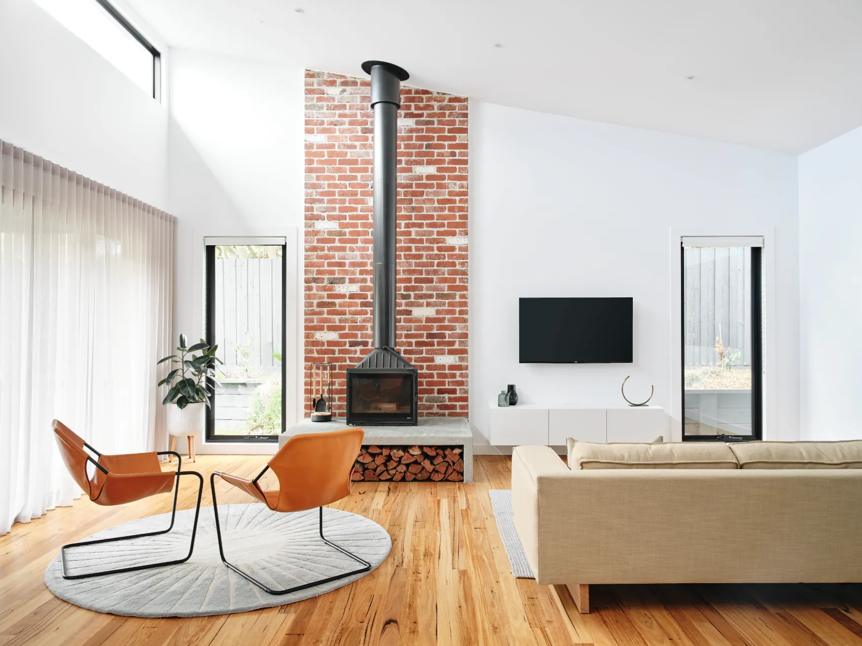 This single level home was built for a young family, passionate about modern design. To maximise space and light, a raked ceiling with clerestory windows were included, while clever zoning of bedrooms and entertaining areas makes for a home that is as practical as it is stylish. The design centrepiece is an exposed brick chimney crafted from recycled bricks, lending a timeless narrative to the space.