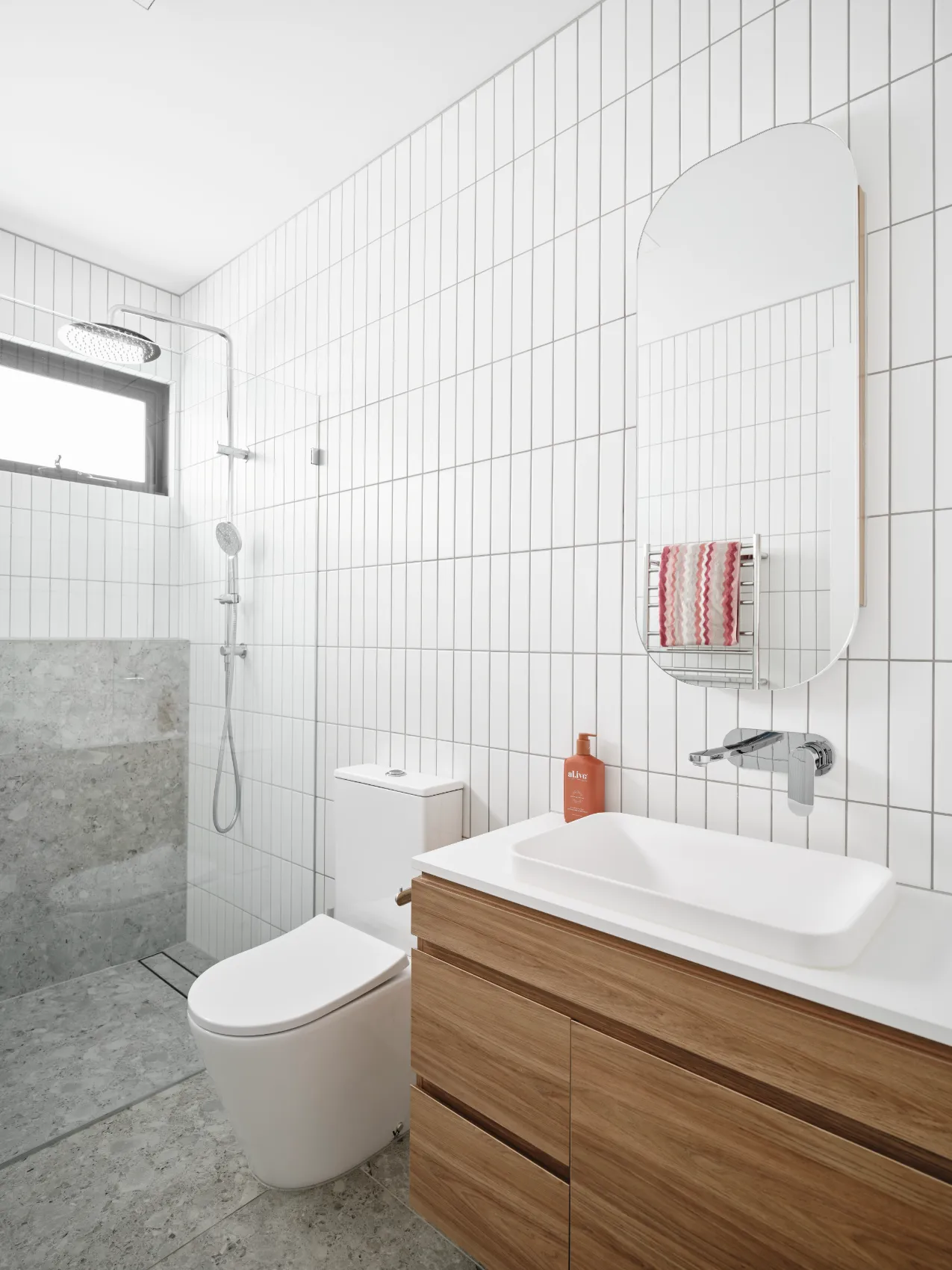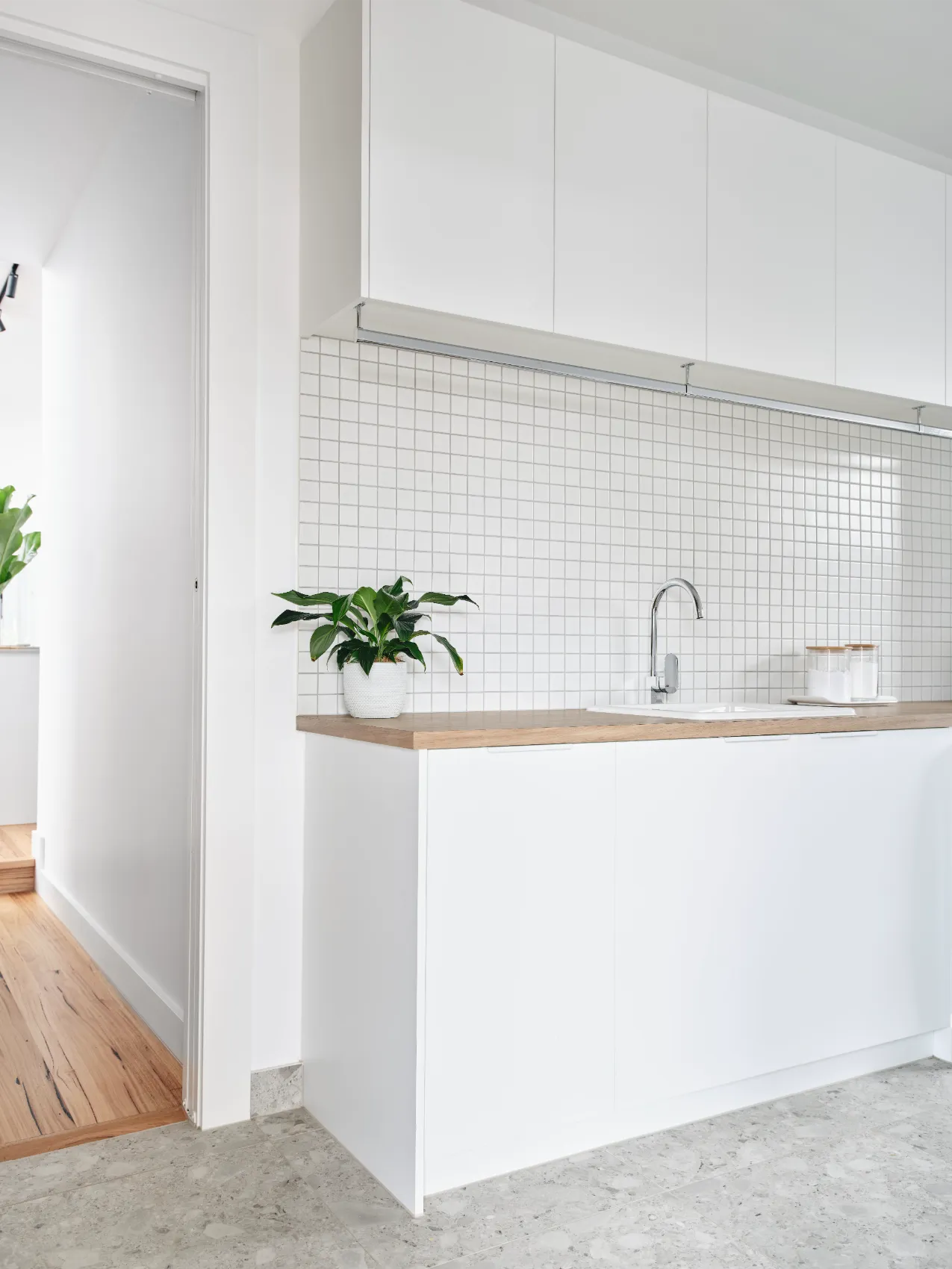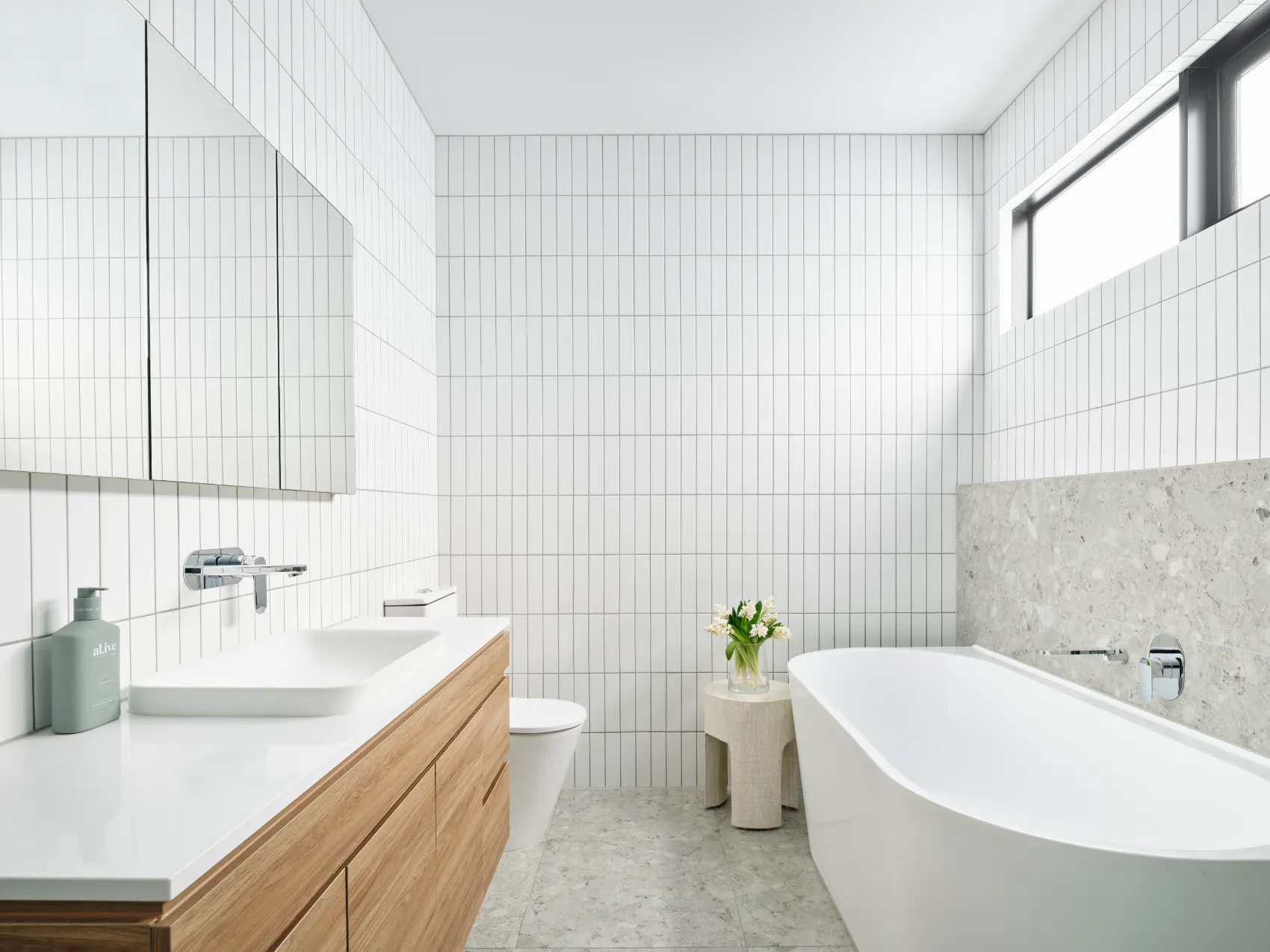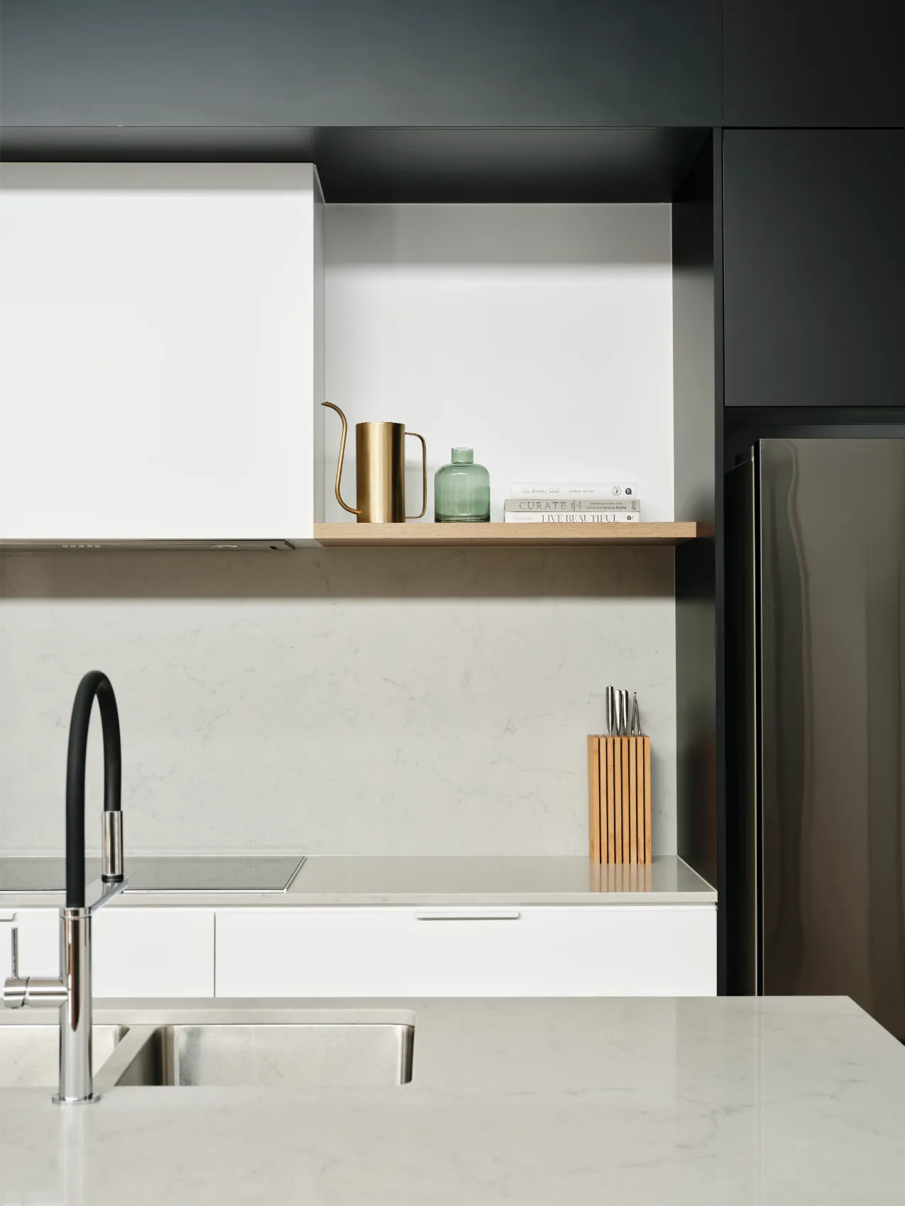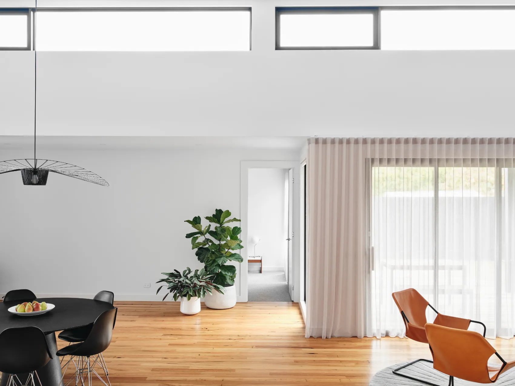 This single level home was built for a young family, passionate about modern design. To maximise space and light, a raked ceiling with clerestory windows were included, while clever zoning of bedrooms and entertaining areas makes for a home that is as practical as it is stylish. The design centrepiece is an exposed brick chimney crafted from recycled bricks, lending a timeless narrative to the space.